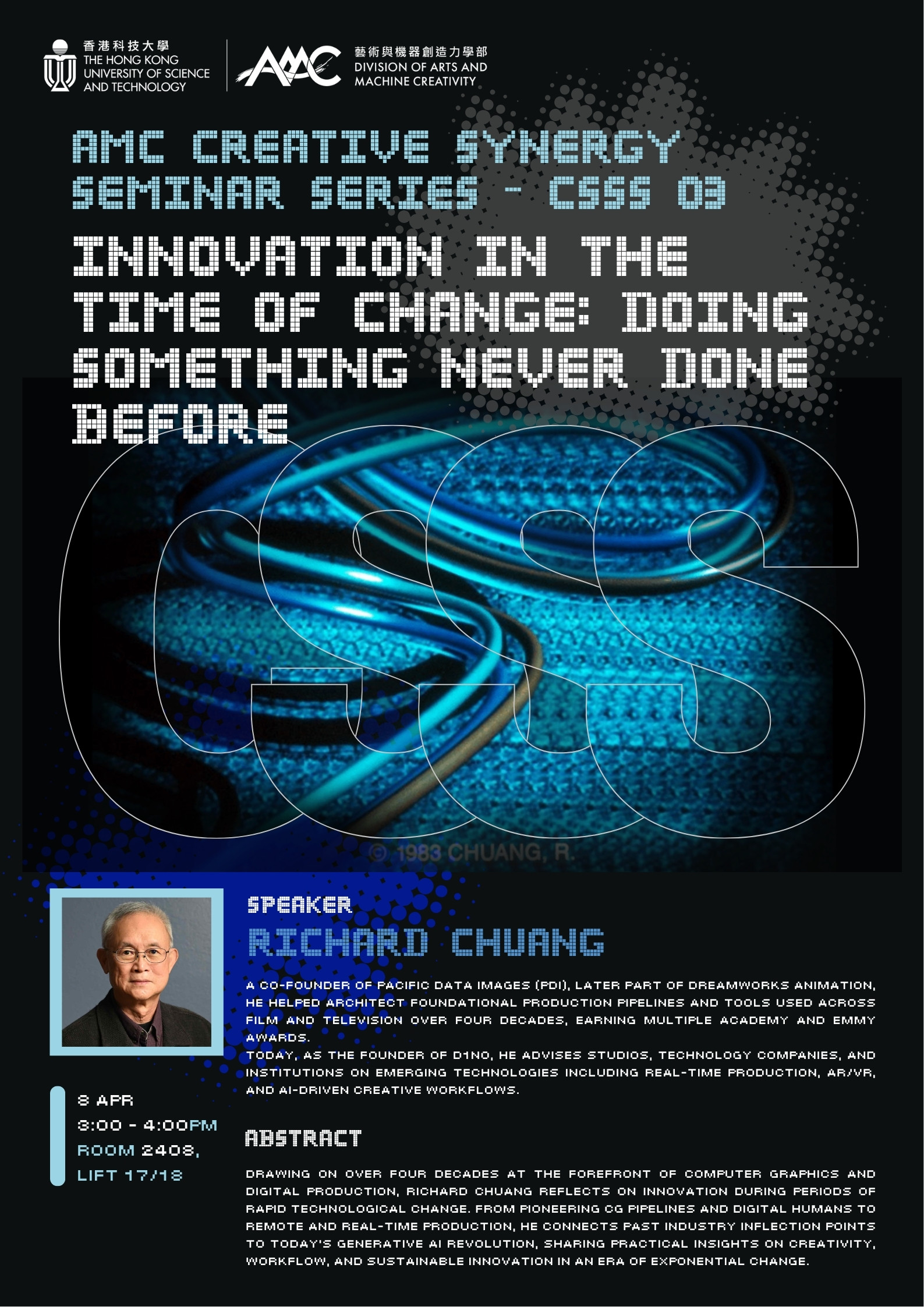 The Division of Arts and Machine Creativity (AMC) is thrilled to announce the third instalment of the AMC Creative Synergy Seminar Series, aiming to foster dialogue and innovation across disciplines through inspiring talks from renowned experts at the forefront of art and technology.