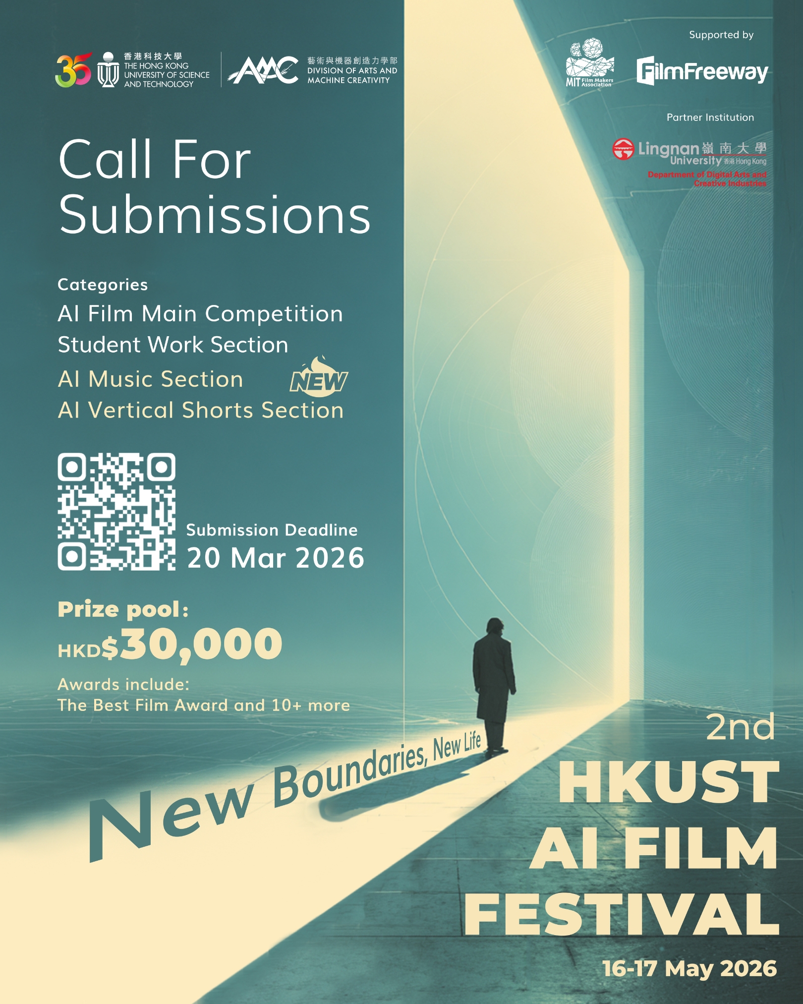Following the launch of our Call for Submissions for the 2nd HKUST AI Film Festival, the Division of Arts and Machine Creativity (AMC) is excited to announce an expansion of submission categories, a larger prize pool, together with an extension of submission deadline, opening the festival to an even broader range of AI‑driven creative practices.